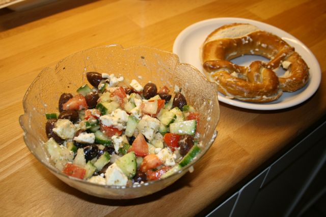 Zubereitungszeit:ca. 15 Minuten Zu diesem Gericht...Den Griechischen Bauernsalat haben wir das erste Mal auf dem Peloponnes gegessen. In ähnlicher Form wie in der Taverne am Strand haben wir ihn schon häufig zubereitet, am liebsten im Sommer. Die Herstellung ist schnell und einfach, guter Geschmack der Zutaten ist hier sehr wichtig für das Ergebnis. Am besten isst man ihn frisch mit etwas hellem Brot (Pida, Baguette, Brötchen, Laugenbrezel...), damit er nicht so viel Flüssigkeit ziehen kann. |